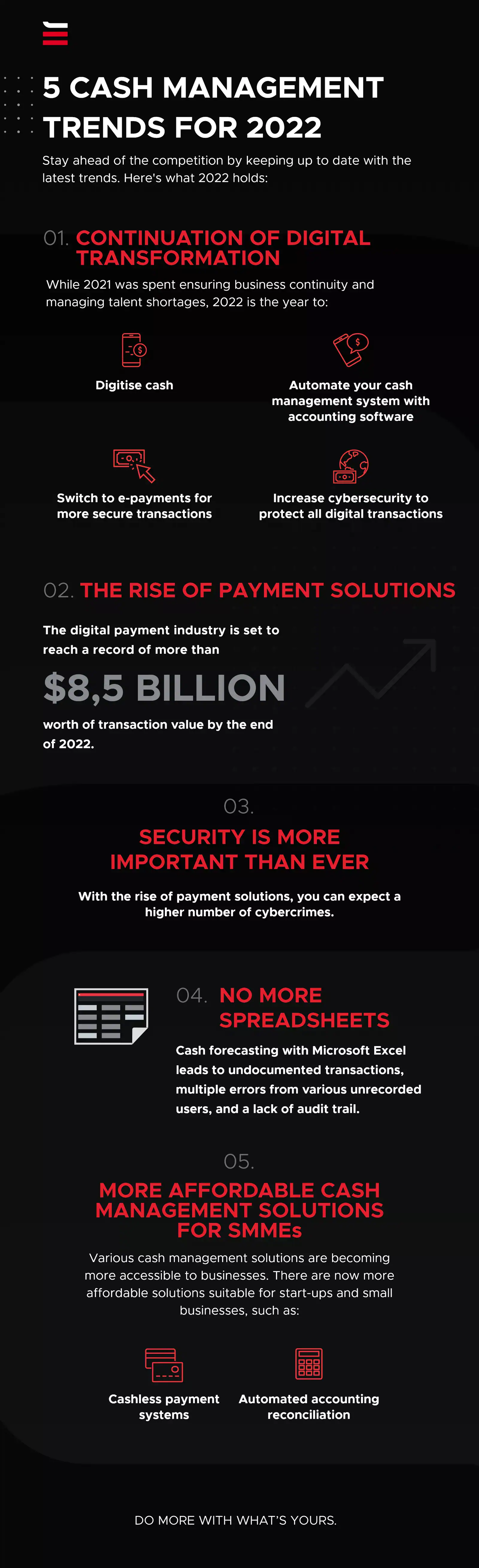 Many businesses are seeing the rewards from implementing cloud-based cash management technology that can help improve processes and the flexibility within the organisation while prioritising security. Companies that continue to automate and digitise their operations by switching to accounting and cash flow software will be able to apply better forecasting to their decision-making process and improve their financial operations and daily treasury records.